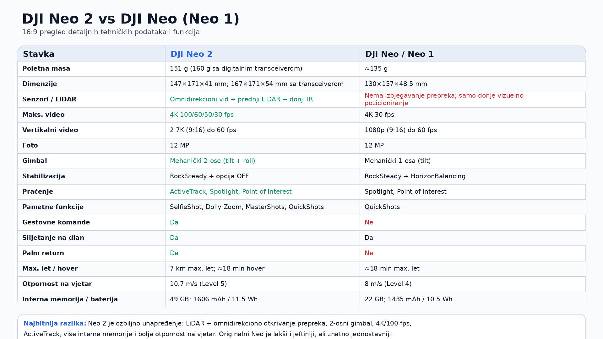 DJI Neo 2 pozicioniran je kao lagani, kompaktni dron za početnike i putnike koji žele „uzmi i leti” iskustvo. Fokus je na jednostavnom upravljanju, stabiliziranom snimanju i paketima dodatne opreme koji produžuju vrijeme u zraku. Najvažnije značajke: