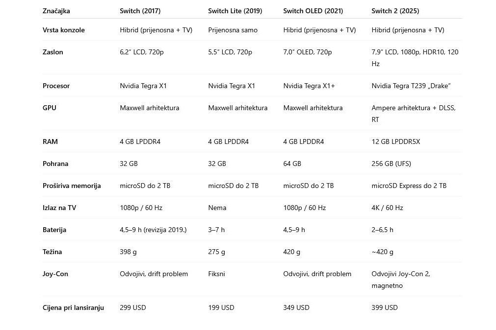 U međuvremenu, Nintendo je izbacio nekoliko varijanti: Switch Lite 2019, fokusiran isključivo na prijenosno igranje, te Switch OLED 2021, s većim i ljepšim zaslonom. No, hardverska osnova ostala je ista, a konkurencija u obliku Steam Decka, ASUS ROG Allyja i drugih prijenosnih PC konzola počela je pritiskati.