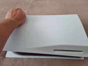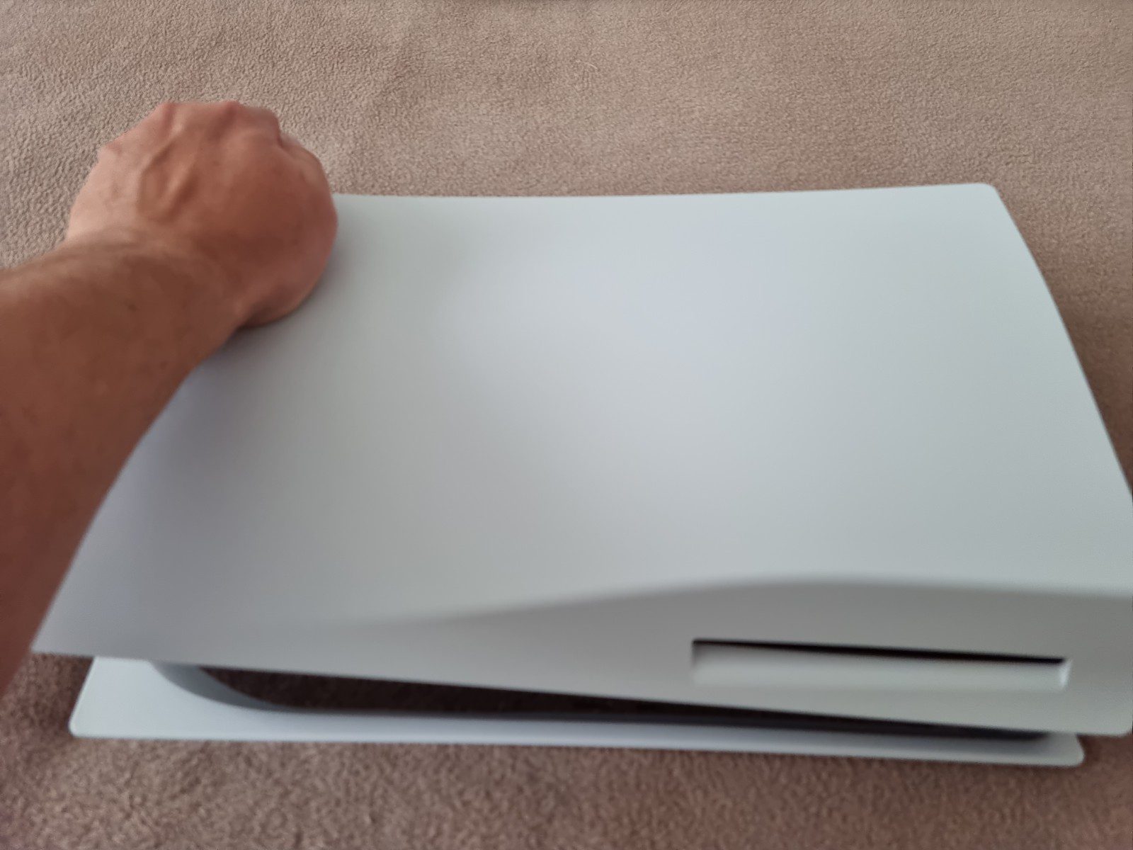 Nakon što ste uradili PS5 update i pripremili odgovarajuću M.2 SSD karticu položite vaš PS5 na lijevu stranu kao na slici. Kod disk verzije će disk jedinica biti prema gore. Lijevom rukom povucite gornji rijevi rub blago prema gore i onda uz pomoć obe ruke cijeli poklopac malo prema desno (cca 2cm). Nakon toga se poklopac može lako ukloniti i vaš PS5 je otvoren.
