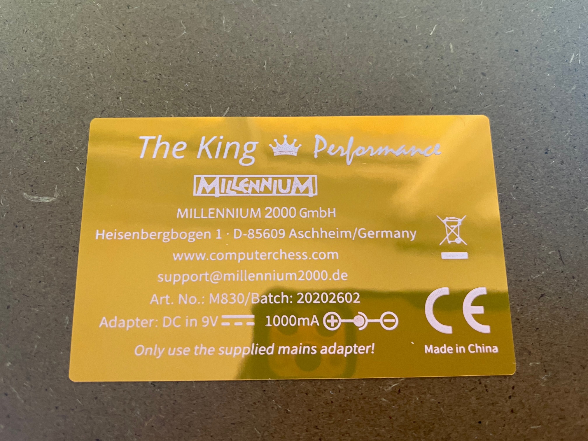 Millennium Chess The King Performance trenutno je jedan od najboljih šah kompjutera koji možete kupiti. Okvir je drveni kao i ručno izrađene figure. Podloga osjetljiva na dodir sa led diodama koje označavaju poteze je od kvalitetne plastike i izgleda kao da je od drveta. Kvalitet izrade skoro pa savršen (metalni poklopac kod tipki i ekrana bi mogao biti i bolje zalijepljen, ali ništa značajno). Dimenzije su 40x40x2.6 cm, visina kralja 7.2cm.