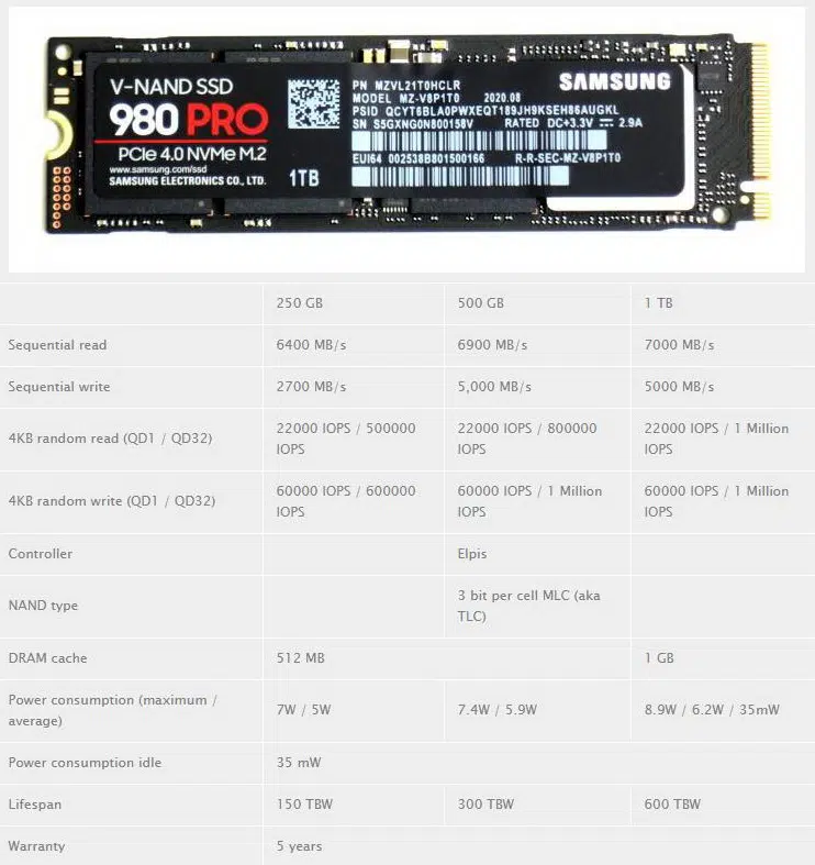 Umjesto MLC-NAND (multi-level cell) sa 2 bit-a po ćeliji, prvi put u Pro seriji Samsung prelazi na TLC-NAND sa 3 bit-a i preko 100 slojeva ćelija. Pretpostavlja se da to utječe na izdržljivost i sposobnost “pisanja” zato što je sam postupak mnogo složeniji (TBW upola manji nego kod 970 Pro) . Zbog toga Samsung koristi SLC-Cashe (TurboWrite 2.0) za ubrzavanje postupka pisanja, odnosno podaci za pisanje budu trenutno pohranjeni u bržem SLC modusu (“kešu”) da bi onda u pozadini bili trajno snimljeni u sporijem TLC modusu. Hlađenje kontrolera poboljšano je slojem Nikla, a cijeli ssd hladnjakom od bakrene folije. Uz Thermal Guard tehnologiju više nema usporavanja zbog povećane temperature. Bez obzira na neke mane (usporavanje pisanja kada se cache napuni, manji TBW,…) Samsung 980 Pro trenutno je najbolji M.2 PCIe 4.0×4 SSD. Preporučujemo uglavnom verzije od 1TB i 2TB. Prema dostupnim podacima, verzija od 2TB (trenutno nedostupna u prodaji) ima TBW od 1200TB. Iako kod 1TB modela je TBW “samo” 600TB, trebaće vam 15-ak godina doseći maksimum pri pisanju od 100GB dnevno. Znači za prosječnu upotrebu više nego dovoljno.