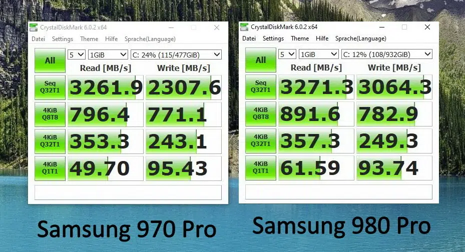 Samsung 980 Pro imamo trenutno u tri varijante (250GB, 500GB i 1000GB, kasnije i 2TB). Nedugo nakon puštanja u prodaju, zbog velike potražnje je 980 Pro teže dostupan. Iako Intel platforme još ne podržavaju PCIe 4.0×4 SSD, 980 Pro je moguće koristiti u sadašnjim konfiguracijama (PCIe 3.0×4 socket) uz solidna poboljšanja. Kod naše testne konfiguracije (Intel Core I9-9980XE, Asus Rampage VI Extreme Omega, 64GB G.Skill RAM 3600MHz) novi Samsung 980 Pro donio je poboljšanja pri pisanju. Pri Crystal Disk Mark testu brzina čitanja je neznatno porasla, dok se kod brzine pisanja podataka vidi znatnija razlika. Puni kapacitet novog Samsung 980 Pro-a moći ćemo iskoristiti tek kada se pojave kompatibilni Intel procesori (AMD platforme već su kompatibilne ali nama još nisu interesantne). Nejasno je zbog čega tenutno stagnira Intel-ov razvoj. Priča se da će možda AMD “progutati” Intel što ne bi bilo dobro za tržište.