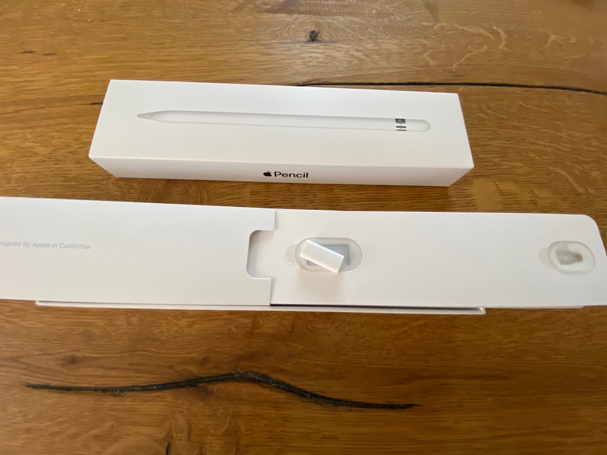 Prvi Apple Pencil pojavio se 2015-e godine zajedno sa prvom Ipad Pro generacijom tableta. Iako to nije bila nikakva senzacija jer je takvo nešto već postojalo, Apple opet uspijeva ponuditi nešto praktično, funkcionalno sa dobrim dizajnom. Ovaj pencil ima na sebi lightning priključak za punjenje i spajanje na Ipad. Izrađen je od kvalitetne plastike glatkog finiša te dobro “leži” u ruci. Sa jednim punjenjem (otprilike 30 minuta) pencil 1-e generacije izdrži do 12 sati. Može se napuniti spajanjem na tablet ili pomoću adaptera na bilo koji punjač sa lightning priključkom. Ako je baterija pri kraju, spajanjem 15 sekundi na tablet dobijate opet oko 30 minuta rada sa pencil-om. U pakovanju Pencil-a prve generacije nalazi se još adapter za spajanje na punjače kao rezervni špic koji se mijenja kada više ne bude bio gladak za pisanje odnosno potrošen od puno crtanja ili pisanja. Iako je u početku Apple Pencil 1-e generacije bio kompatibilan samo sa prvom serijom Ipad Pro modela, vremenom se, ponudom novih modela Ipad-a, ta lista proširila. Svi pencili su inače tako konstuirani i podešeni da Ipad razlikuje različite jačine pritiska na ekran kao i nagib.