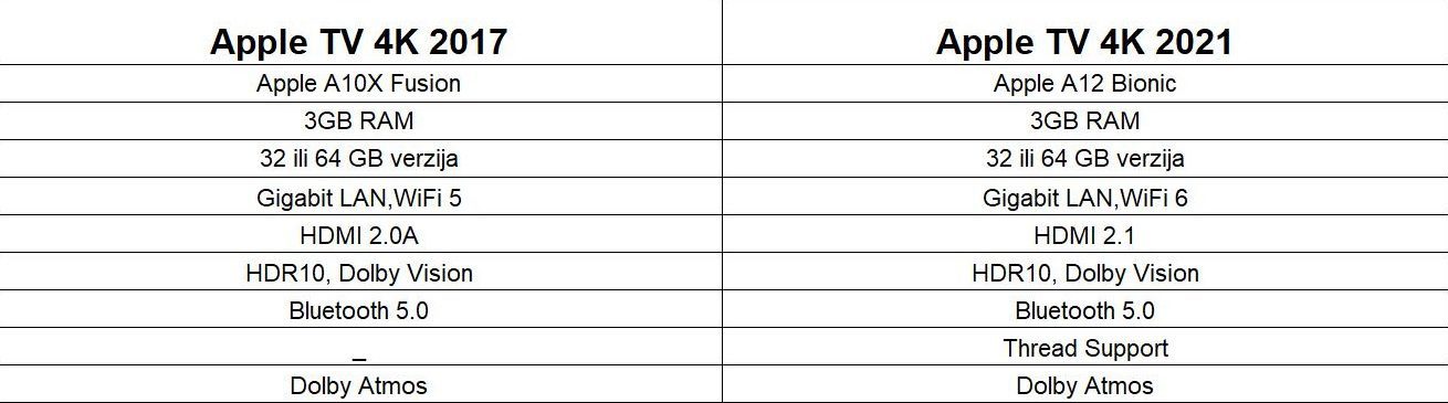 Na prvi pogled nije se desilo mnogo ali video/ audio prikazivanje dobilo je primjetno na kvaliteti. Nismo uspjeli saznati koju je točno maksimalnu “video kvalitetu” mogao prikazivati box iz 2017-e godine jer je Apple to prilično sakrio (pretpostavljamo da je imao 4K HDR pri samo 30Hz). Apple TV 4K 2021 može prikazati 4K HDR sadržaj pri osvježenju ekrana (učestalosti) od 60Hz (60 puta 3840 x 2160 tačaka u jednoj sekundi). Kako je Apple uređajima uvijek dostupna maksimalno moguća programska podrška tako će se ovaj box uvijek maksimalno uklapati u vaš apple sistem. Ukoliko “vežete” box preko WiFi-a sada su vam dostupne mnogo veće brzine prenosa pod uslovom da imate ruter koji podržava WiFi 6 (802.11ax). Ono što će se većini apple tv korisnika svidjeti je kompletno redizajnirani dalinjski upravljač. Zadnji daljinski od Apple TV 4K 2017 bio je apsolutni promašaj zbog nepraktičnosti i blokiranja tipki. Zbog toga su mnogi TV operateri, koji su Apple TV besplatno dijelili, isporučivali dodatno i svoj kompatibilni daljinski.