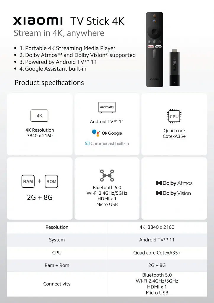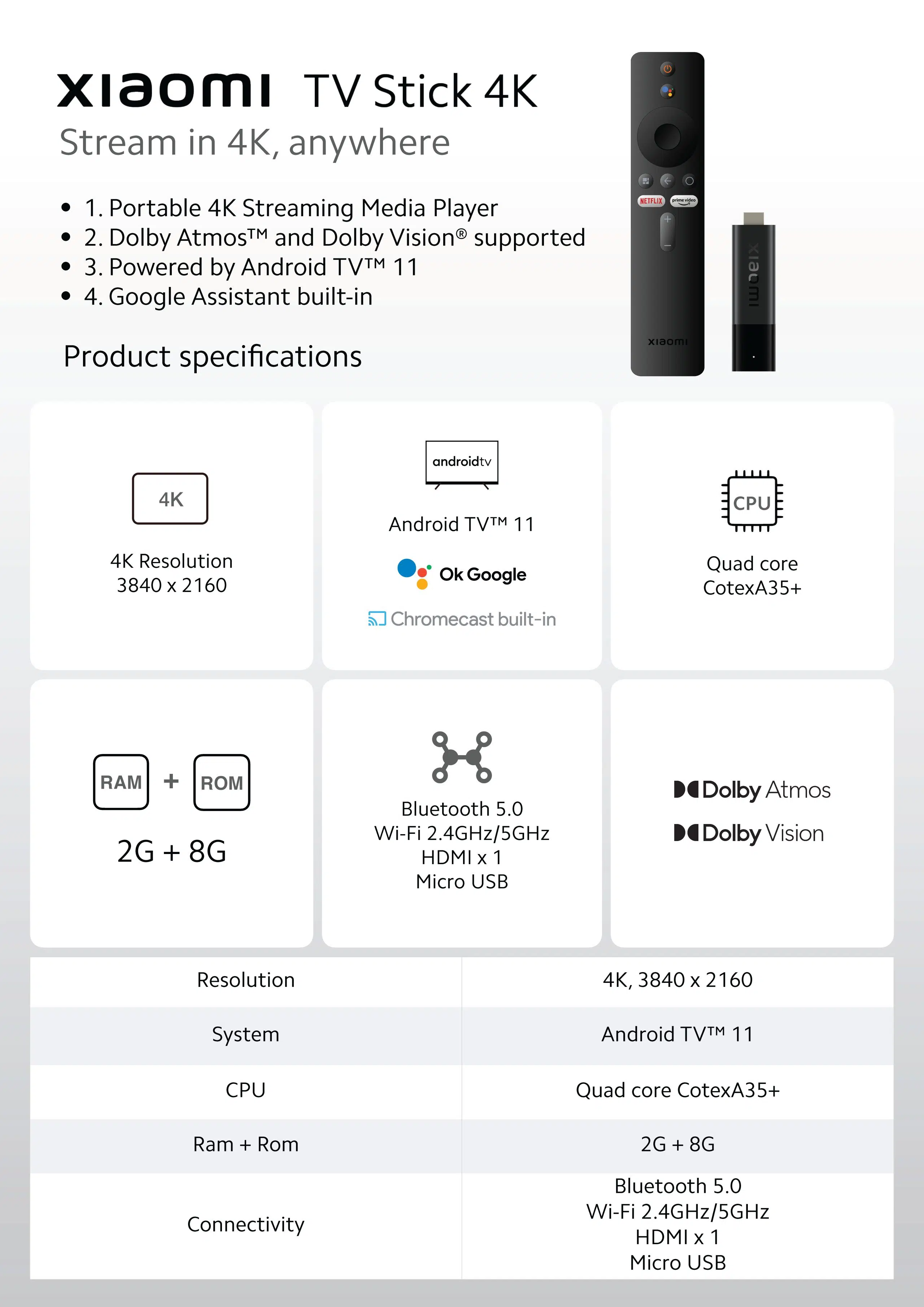 Xiaomi kao tehnološka firma koja se jako trudi ponuditi najbolje proizvode, doradila je dosadašnji 1080p stick i ponudila 4K rješenje. Kako se vidi u tehničkim podacima, moguća je produkcija videa u 4K rezoluciji i 60Hz. Sada je tu i Dolby Atmos/ Dolby Vision tehnologija. Radna memorija povećana je na 2GB, a količina ROM-a ostala je 8GB. Uz cijenu od otprilike 60 E/USD Xiaomi TV Stick 4K je fer ponuda.