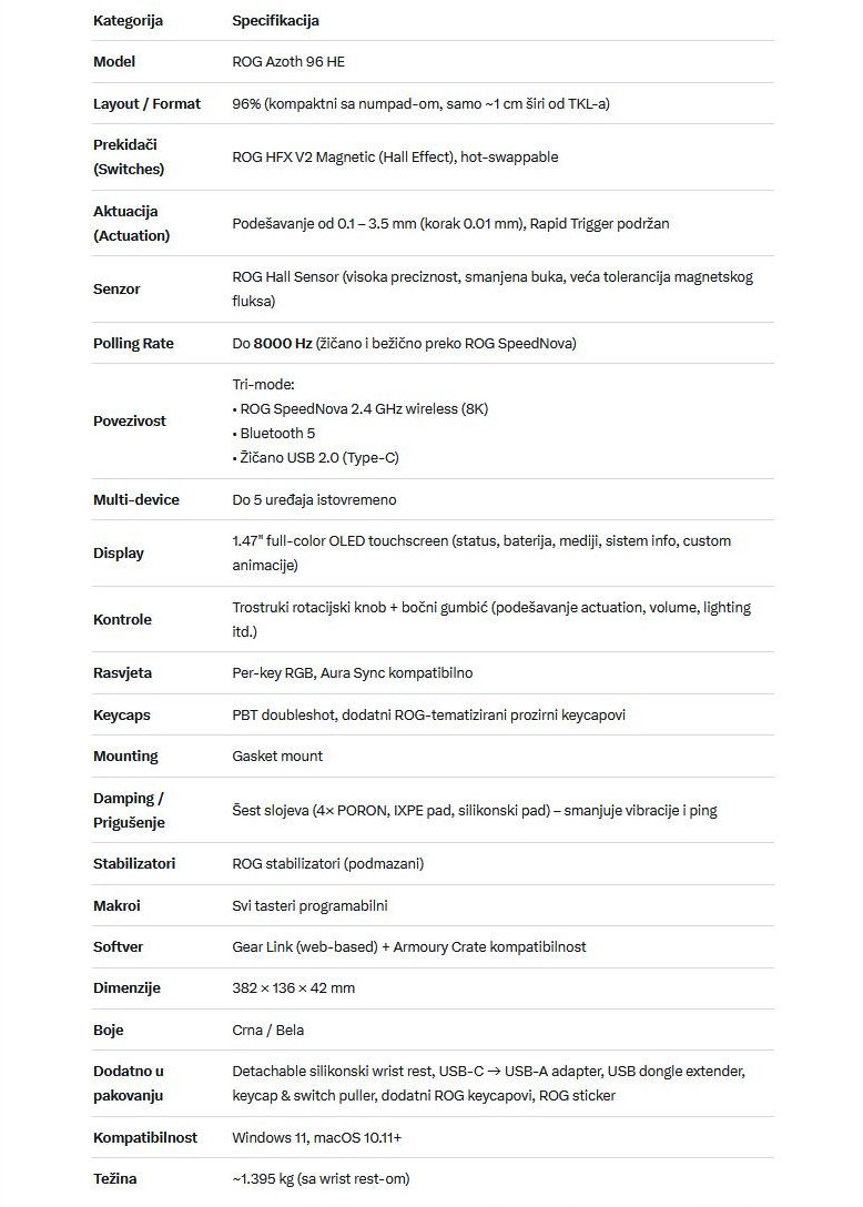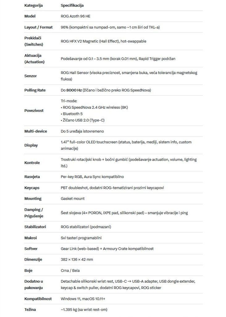 ASUS ROG Azoth 96 HE tastatura je jedan od onih proizvoda koji odmah daju do znanja da su napravljeni za ljude koji tačno znaju što žele od svoje opreme. Na prvu izgleda kao “još jedna” premium gaming tastatura, ali već nakon nekoliko minuta korištenja postaje jasno da je ovo puno ozbiljnija priča posebno za one koji vole kompaktan format, ali ne žele žrtvovati funkcionalnost. Upravo taj 96% raspored je jedna od najvećih prednosti Azotha 96 HE: dobivaš gotovo sve tipke koje ti trebaju u svakodnevnom radu i igranju, uključujući strijelice i navigacijski dio, ali u kućištu koje štedi prostor i ostavlja više mjesta za miš i čišći setup.